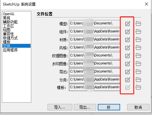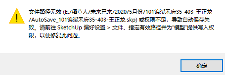 打开sketchup 点击窗口→系统设置(即警告中的偏好设置)然后把有问题的更改位置 (C:\Users\你的用户名\AppData\Roaming\SketchUp\SketchUp XX\SketchUp) 没有文件夹的话自己创建